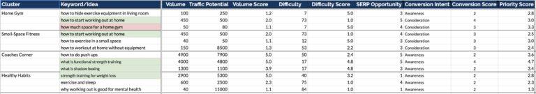 We analyzed the SERP for each query to identify its intent and rich snippet opportunities, and to evaluate content and growth potential. We then used a priority-weighted SEO metric matrix to guide content decisions.